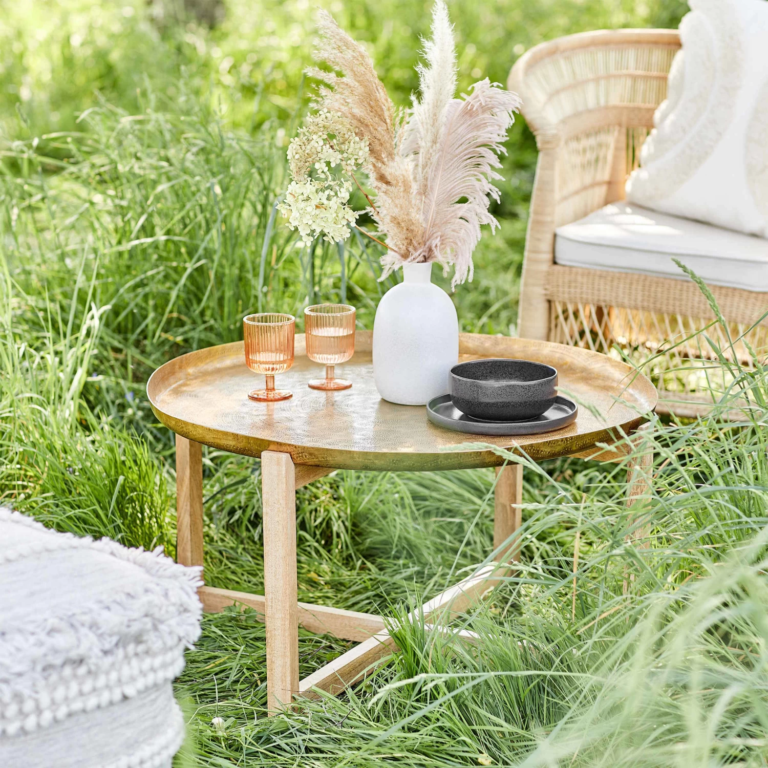 Zu Ihrer nächsten Tea Time lassen Sie sich auf Kissen oder Teppichen nieder und servieren Pfefferminztee auf dem Berber Beistelltisch. Solche niedrigen Tische werden traditionell für Teezeremonien verwendet, dienen in Ihrem Zuhause aber auch als Beistelltisch oder Couchtisch. Das dekorativ gestanzte Aluminium-Tablett mit orientalischem Muster ist dabei ein echter Hingucker, und das geradlinige, faltbare Gestell holt das Design ins Moderne.