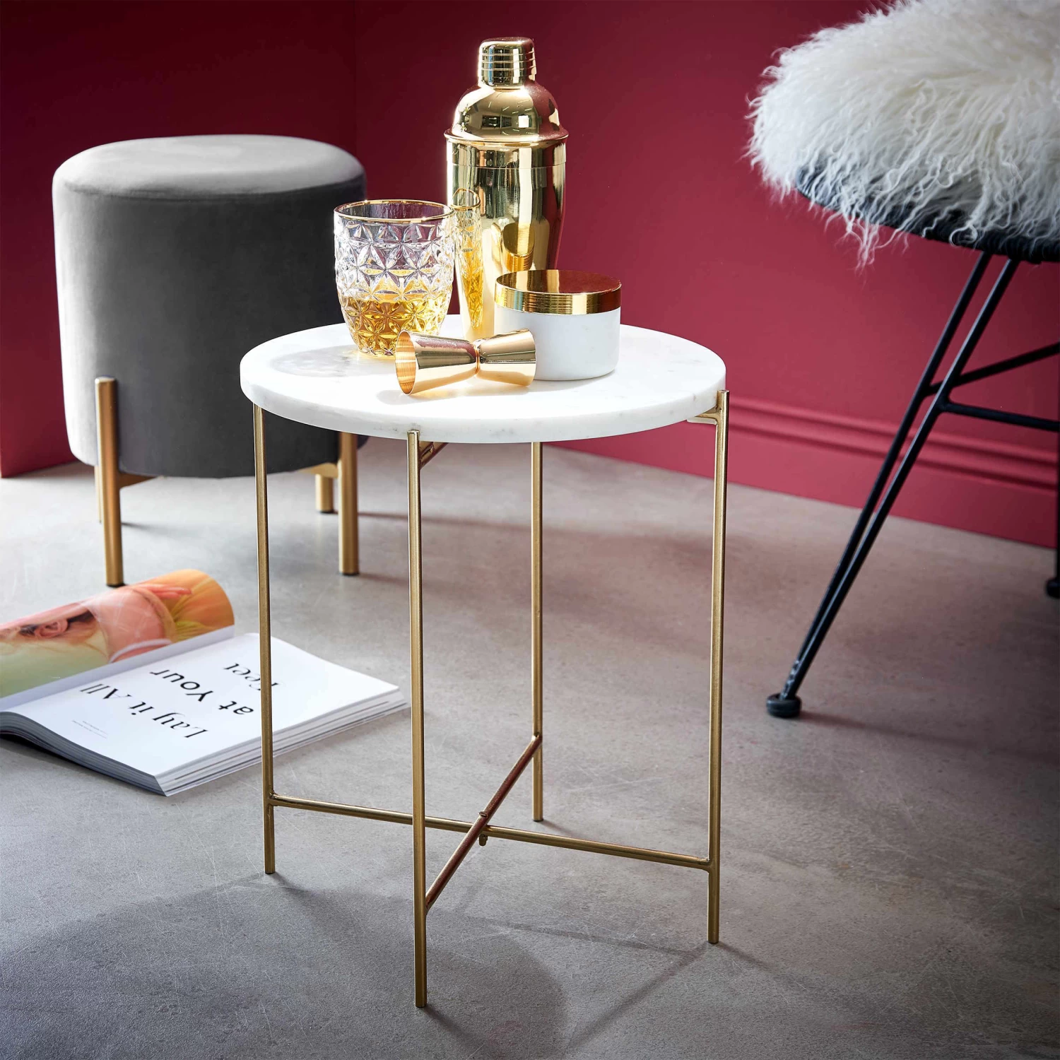 Unser Beistelltisch aus der Marble-Serie erweist sich mit Marmorplatte und faltbarem Gestell als modernes Multitalent beim Einrichten und Dekorieren. Zeitlos schön und modern zugleich eignet er sich ideal als Couchtisch, Buchablage oder Deko-Eyecatcher. Über dem antik anmutenden Goldgestell befindet sich zudem eine edle Platte, die auch separat als Dekoplatte genutzt werden kann. Funktional verfügt das Möbelstück über ein faltbares Gestell, welches ein schnelles und einfaches Zusammenklappen ermöglicht.