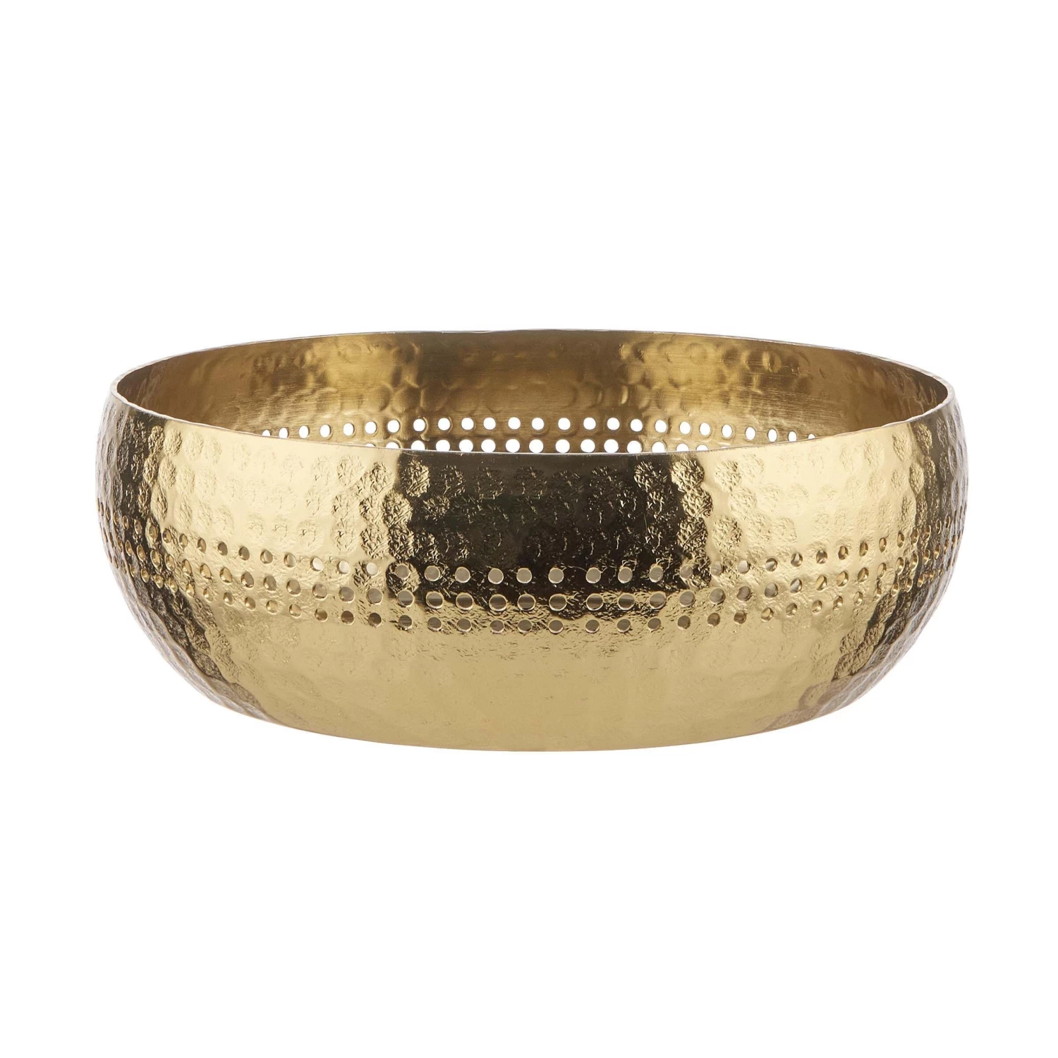 Detailverliebte Handwerkskunst hat eine lange Tradition auf Bali, und daran knüpft die exotische Bali Deko Schale mit Lochrand an. Sie ist aus Aluminium in Gold gefertigt und zusätzlich mit einem aufwändigen Hammerschlag-Muster versehen, das dezente Lichtreflexe entstehen lässt. So wird die Schale zum dekorativen Hingucker auf dem Tisch oder Sideboard, auch in Kombination mit der Bali bauchige Metall Vase in Gold. Nur zu Dekozwecken.