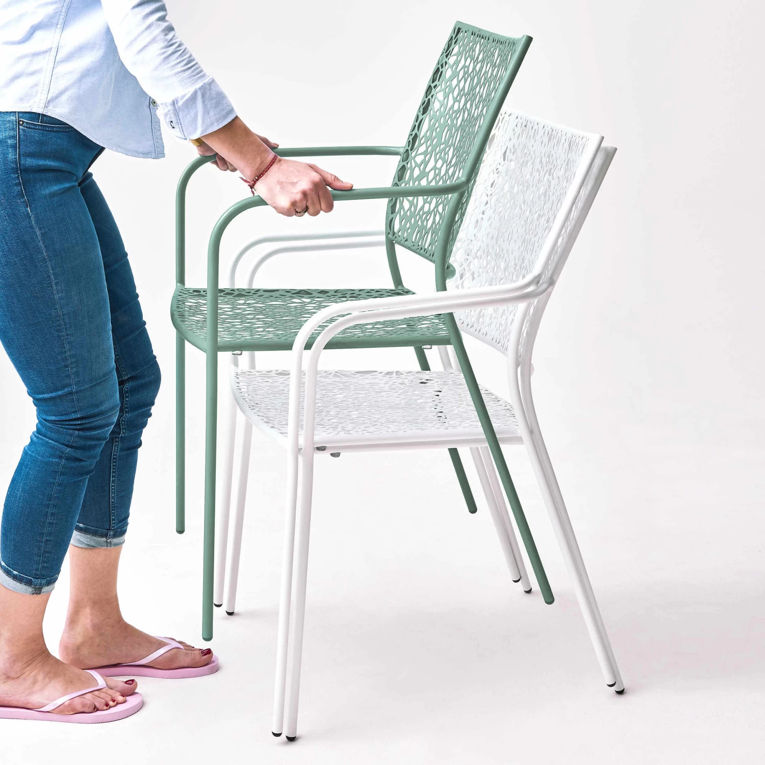 Moderner Look mit romantischem Akzent: Beim stapelbaren Nancy Gartenstuhl aus Eisen für Balkon, Terrasse oder Garten erinnern Sitzfläche und Rückenlehne an filigrane Spitze. Einfach wunderbar, um draußen vor sich hin zu träumen. In weiteren Farben erhältlich.