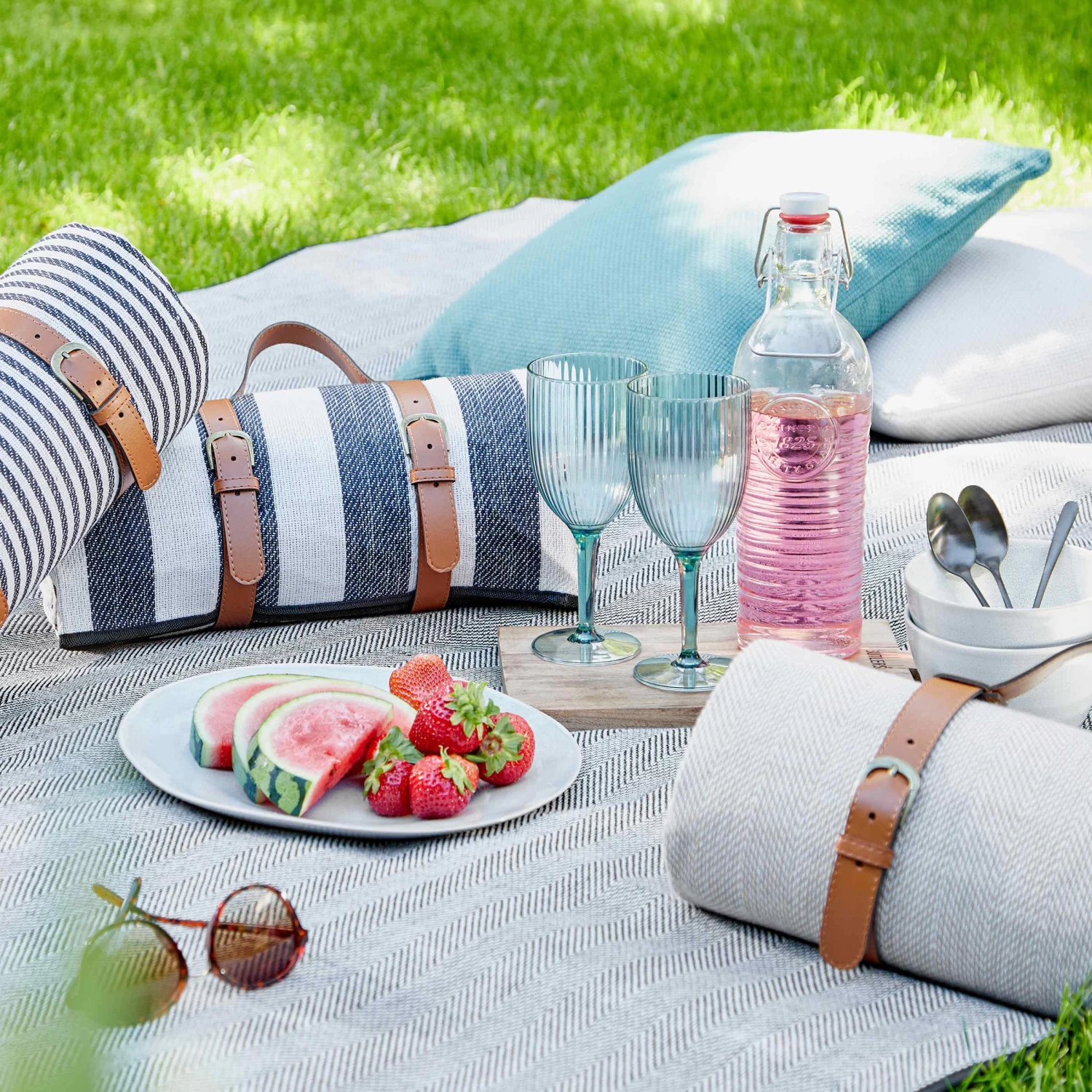 Die Umgebung zu Fuß erkunden – das steht gerade hoch im Kurs. Für die Rast zwischendurch nehmen Sie die schwarz-weiße Wanderlust Picknickdecke mit. Neben einem praktischen Tragegurt bietet sie eine beschichtete, wasserabweisende Unterseite, so dass Sie auch auf Wiesen und im Wald geschützt sitzen. Bei Bedarf lässt sich die Picknickdecke auf 30°C waschen. Weitere Varianten erhältlich.
