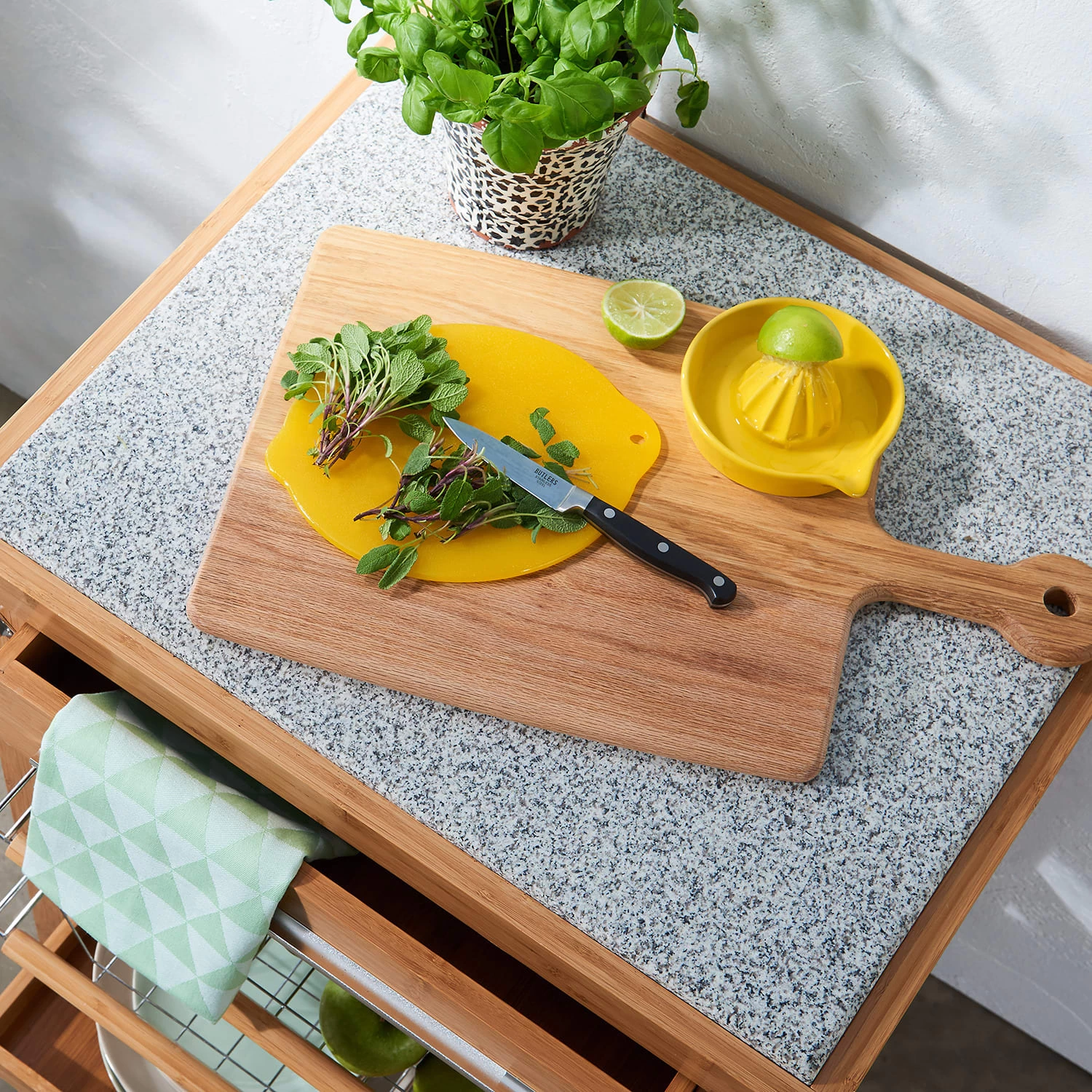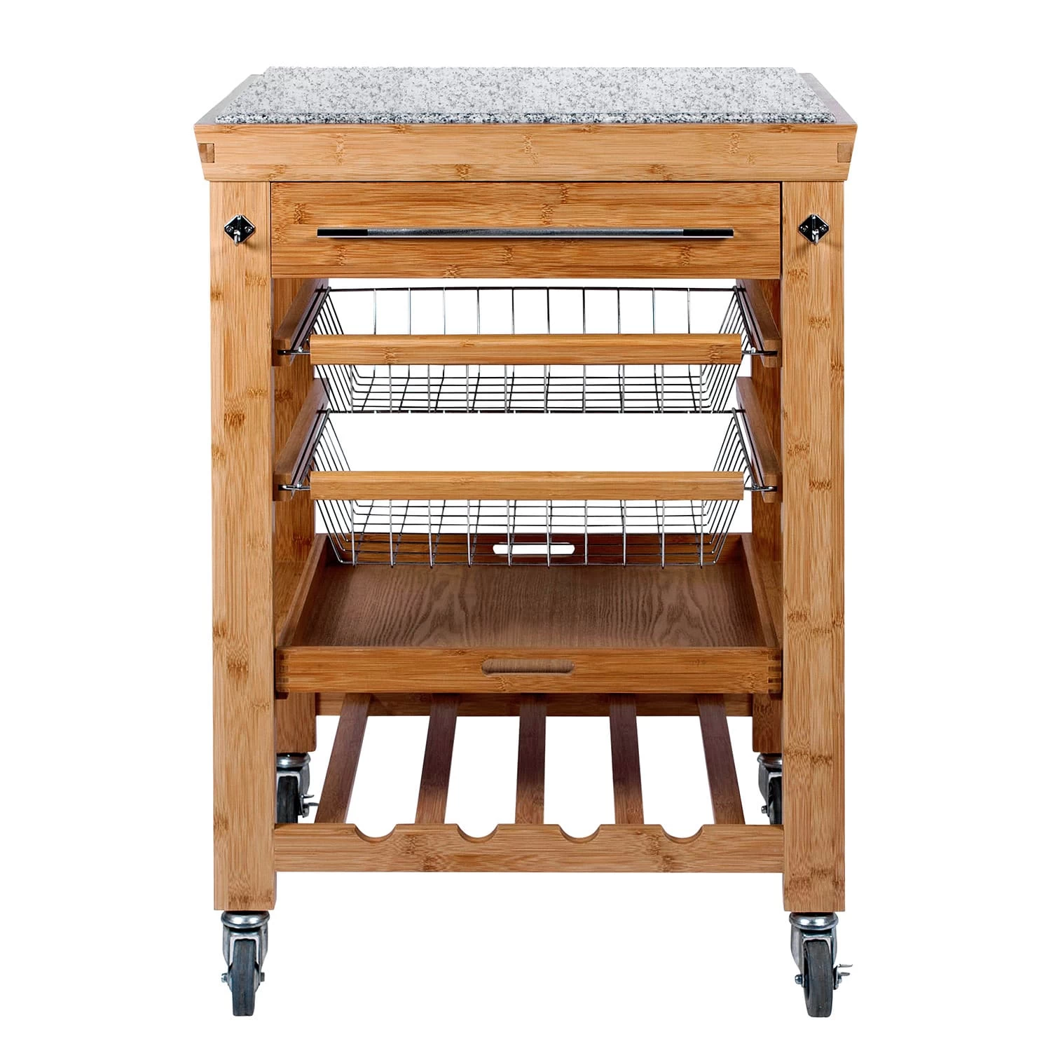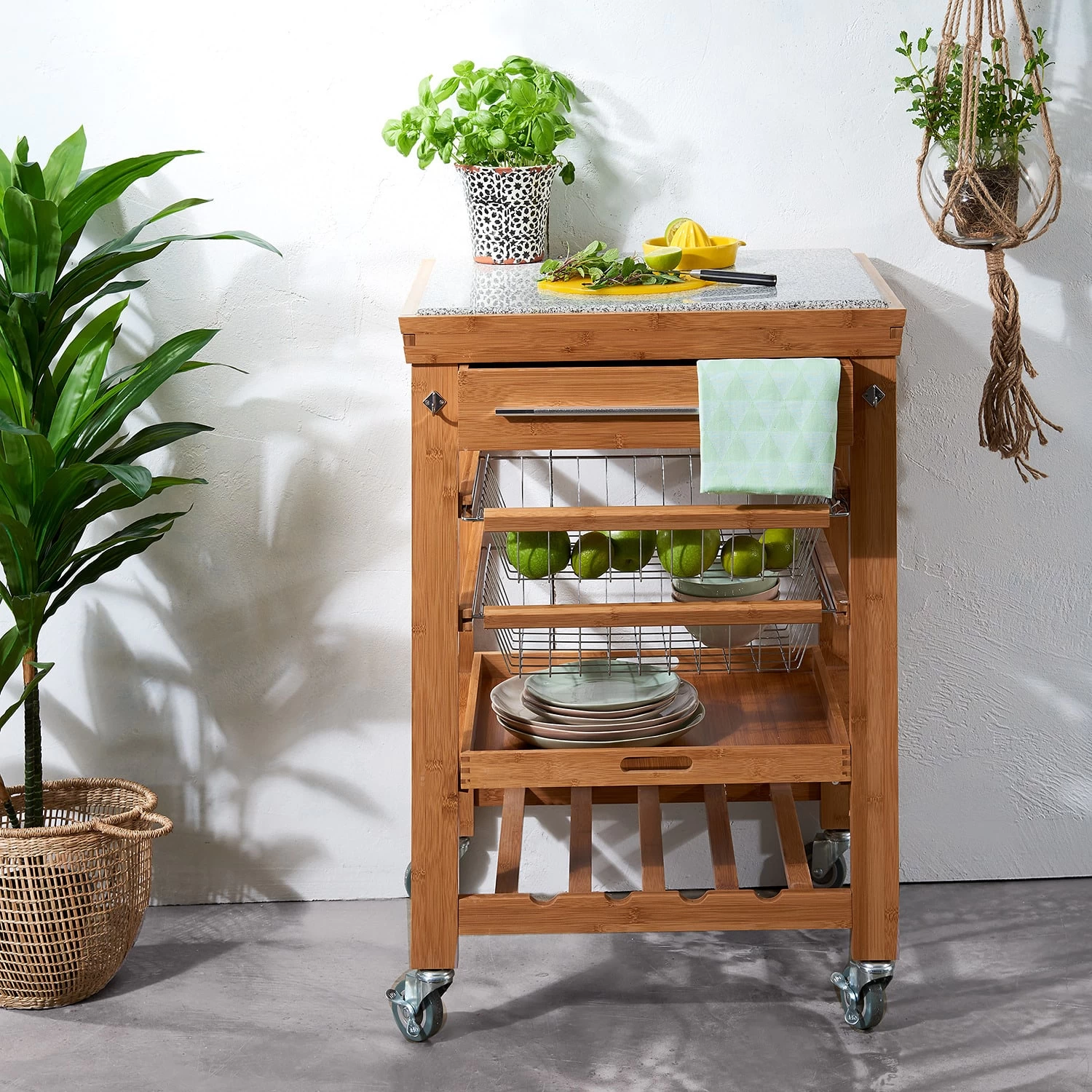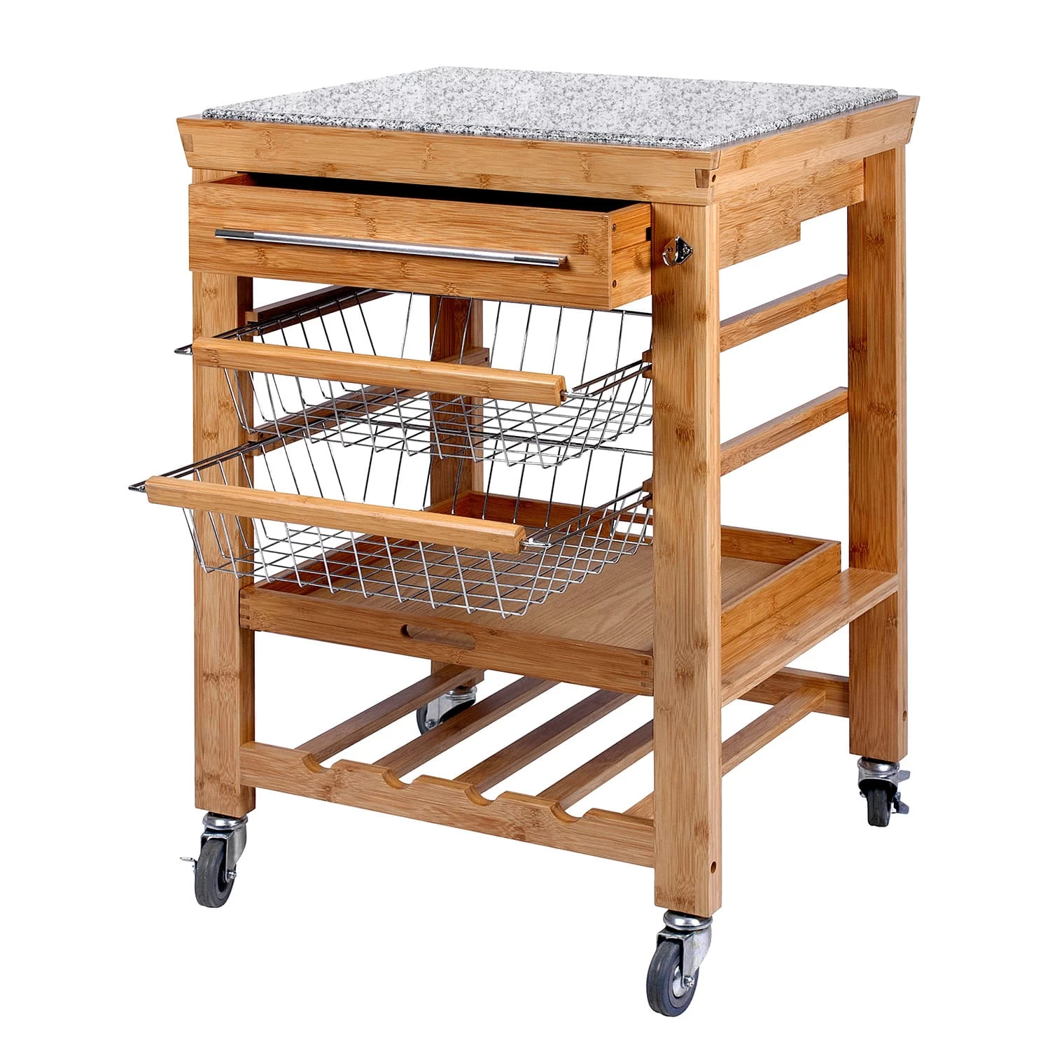 – Mit Schneidefläche aus stoßfestem Granit oben, einer Schublade für Küchen- oder Barutensilien, praktischen Drahtkörben sowie einer Flaschenablage für Getränke.