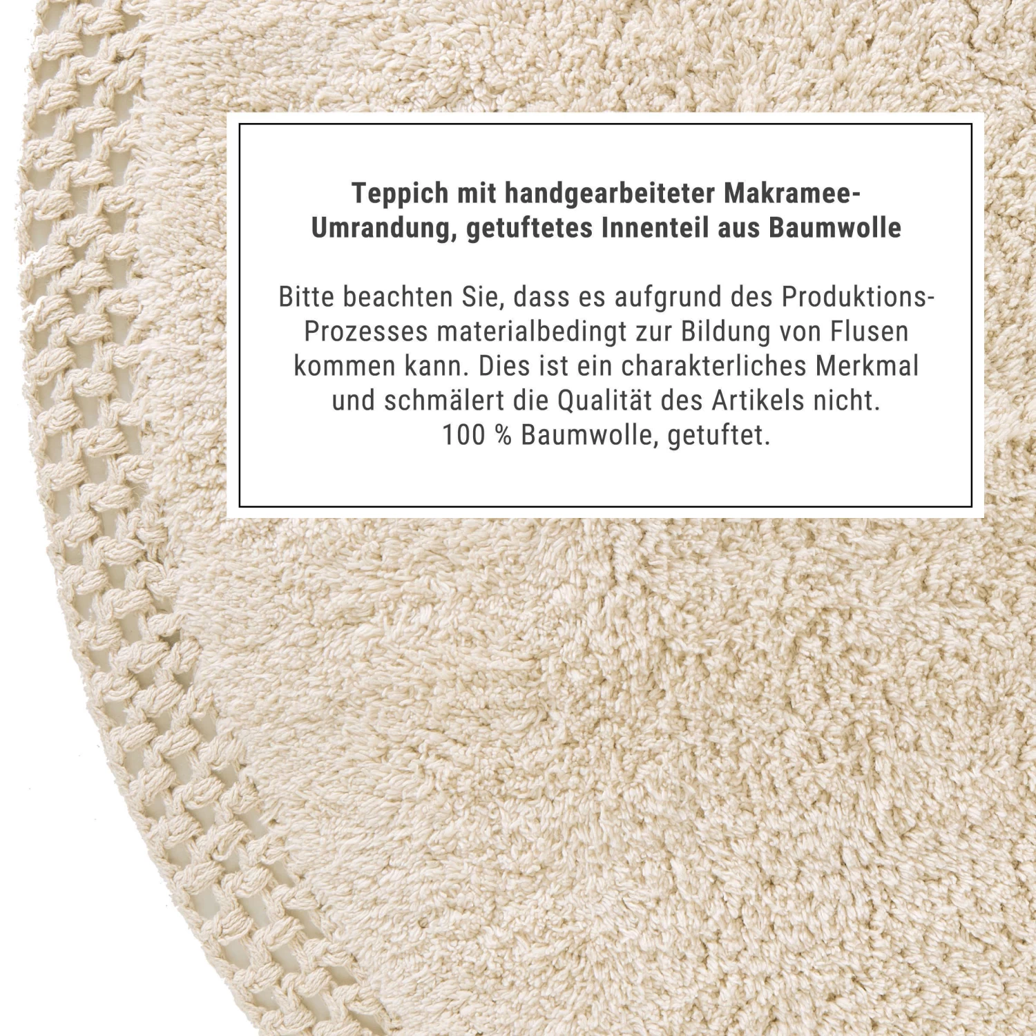 Kuscheliger Hochflor und aufwändig von Hand gearbeitete Makramé-Umrandung – der Boho Lounge Teppich in Beige aus reiner Baumwolle verbindet gleich zwei angesagte Teppich-Trends. Das macht den runden Teppich (120 cm Durchmesser) zu einen doppelt dekorativen Hingucker in Ihrem Zuhause. Ob Sie den Teppich dabei in Ihr Wohnzimmer legen, Ihr Home Office aufwerten oder Ihre Schlafzimmer-Einrichtung abrunden, bleibt Ihrem guten Händchen für schönes Wohnen überlassen.