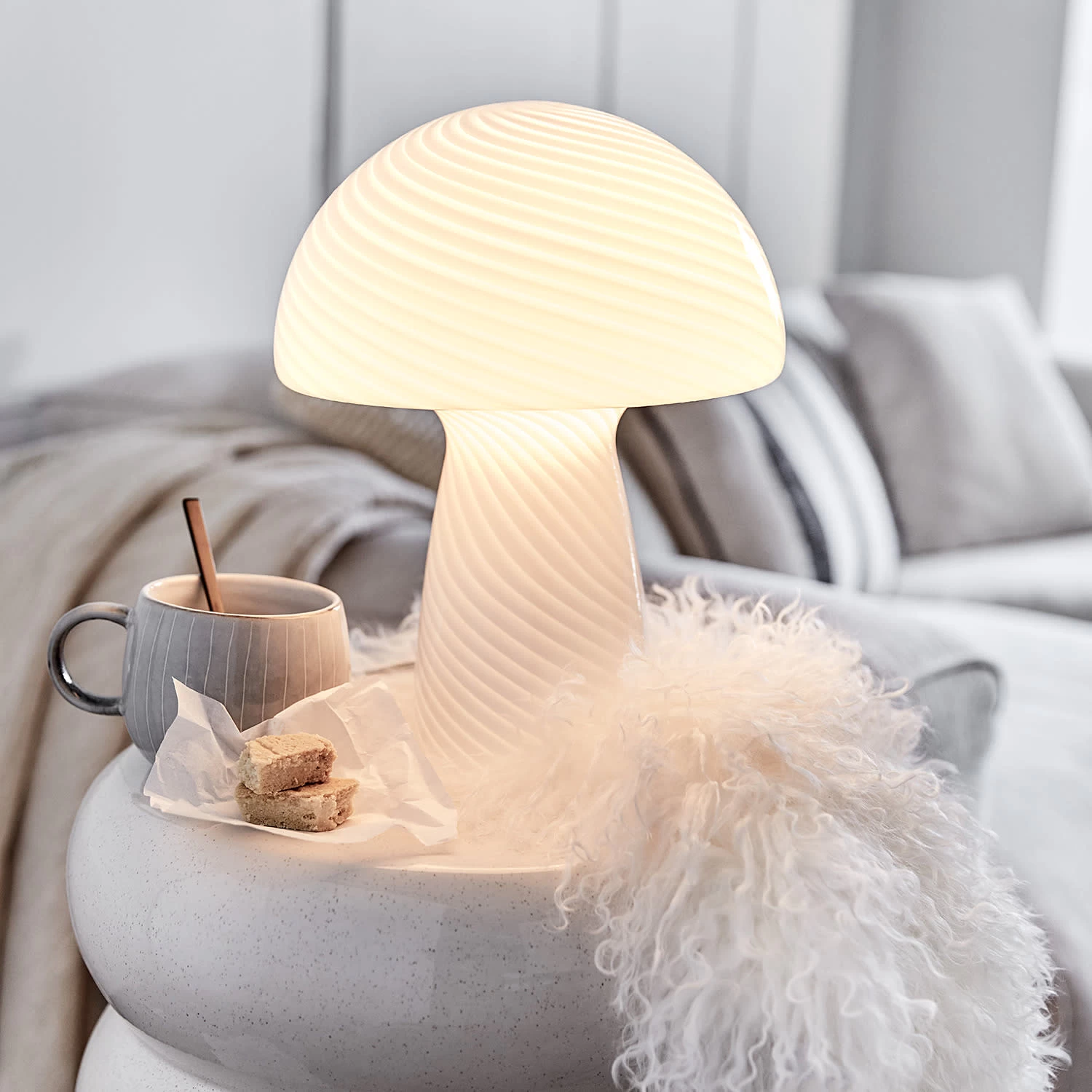 – ELEGANTES DESIGN: Die FUNGI TOWN Tischleuchte besticht durch ihr raffiniertes, grafisches Design und die harmonische Pilzform. Die glänzende Glasoberfläche und der dezente Streifen-Effekt machen sie zu einem echten Hingucker in jedem Raum.