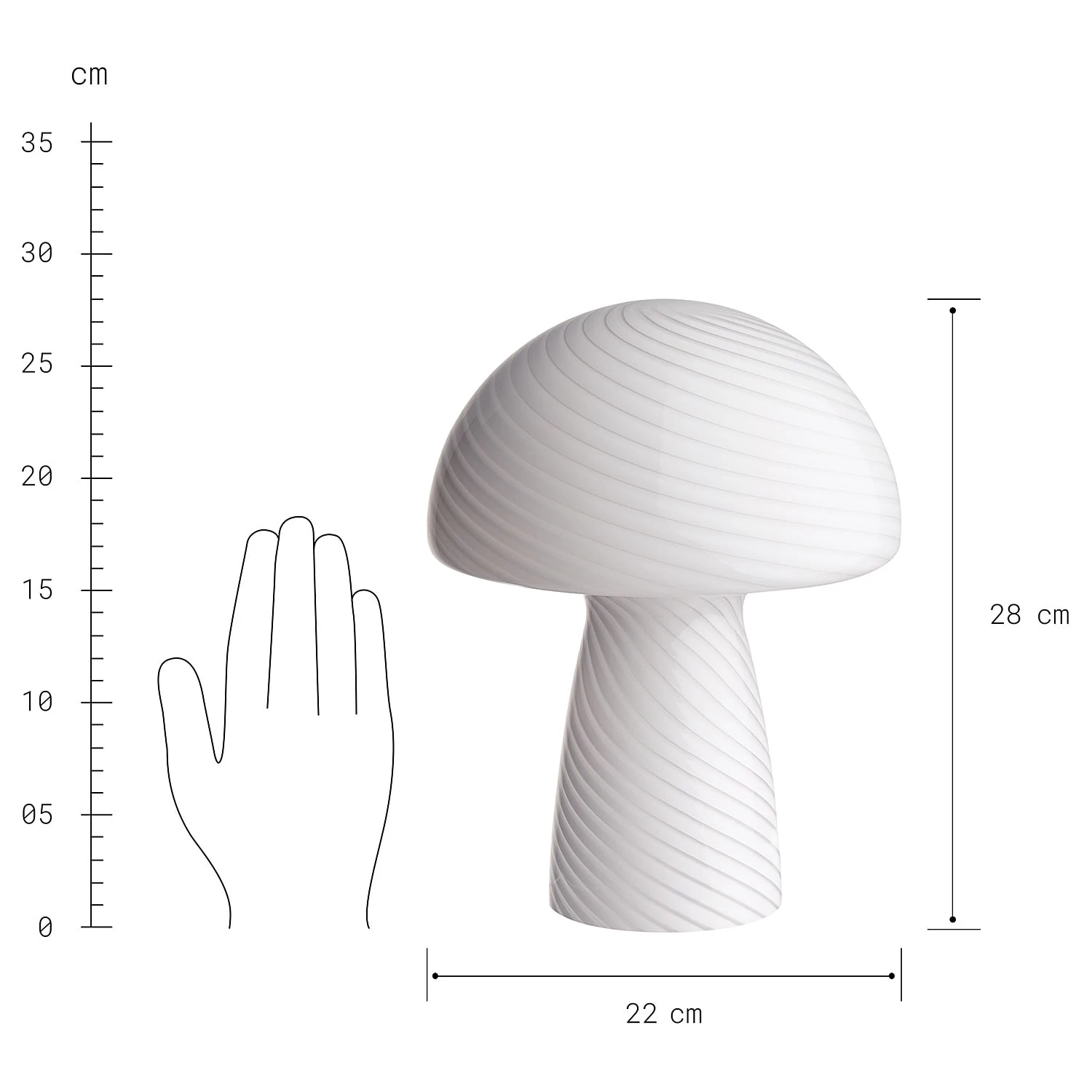 Was macht diese Lampe so besonders? Es ist die Kombination aus Form und Funktion, die die Tischleuchte Fungi Town so einzigartig macht. Das mundgeblasene Glas verleiht ihr eine organische, fast schon lebendige Qualität, während das wellenförmige Muster für faszinierende Lichtspiele sorgt. Und dank des praktischen Kabelschalters ist sie kinderleicht zu bedienen. Ob modern, Boho oder skandinavisch – die Tischleuchte Fungi Town ist ein echter Allrounder. Ihr verspieltes Design fügt sich nahtlos in verschiedene Einrichtungsstile ein und setzt dabei einen charmanten Akzent. Mit einer Höhe von etwa 30 cm und einem Durchmesser von ca. 25 cm (aus Beschreibungstext) ist sie kompakt genug, um auf kleinen Tischen oder Regalen Platz zu finden, und gleichzeitig groß genug, um als dekoratives Element aufzufallen. Der Lampenschirm und der Sockel sind nahtlos aus einem Stück gefertigt, was der Leuchte eine moderne und stilvolle Optik verleiht. Die Leuchte verwendet Standard-E27-Glühbirnen, die leicht austauschbar sind, und das Textilkabel mit 130 cm Länge (aus altem BP) und Kippschalter sorgt für einfache Bedienung. Ideal für Wohnzimmer, Büro, Schlafzimmer und Flur, platziert auf Nachttischen, Schreibtischen, Kommoden oder Sideboards.