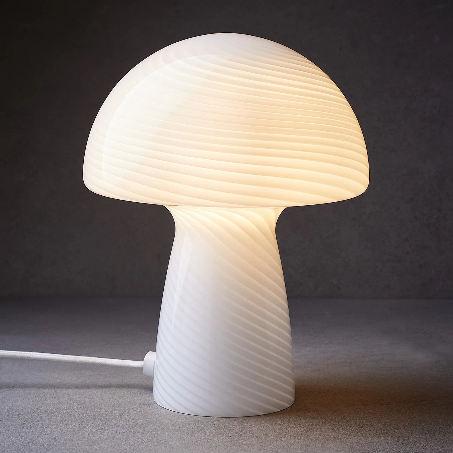 – Was macht diese Lampe so besonders? Es ist die Kombination aus Form und Funktion, die die Tischleuchte Fungi Town so einzigartig macht. Das mundgeblasene Glas verleiht ihr eine organische, fast schon lebendige Qualität, während das wellenförmige Muster fü