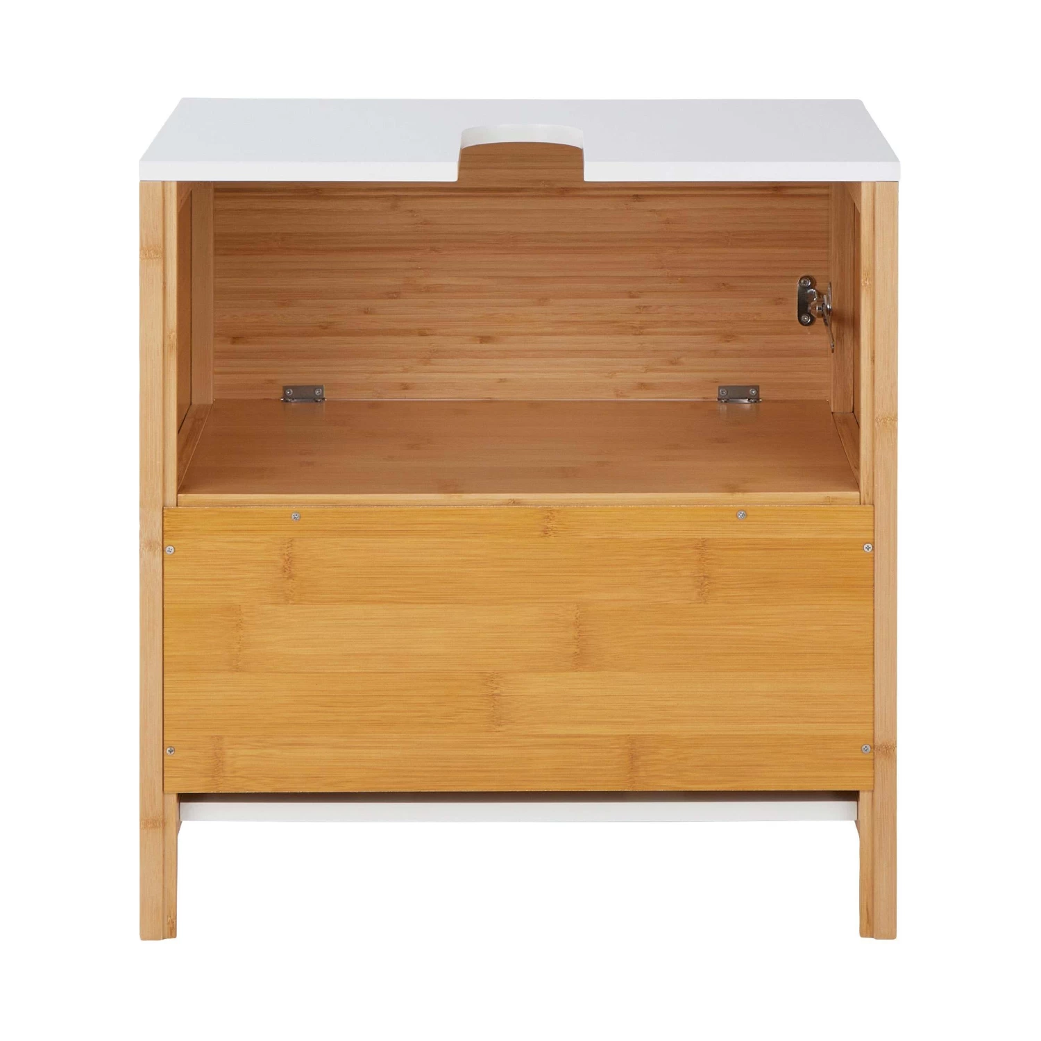 Platz und Ordnung schaffen Sie in Ihrem Badezimmer ganz dekorativ mit dem White Sands Waschbeckenunterschrank mit Klappe und Schublade. In diesem modernen Möbel mit wertiger Optik lassen sich alle möglichen Badezimmerartikel verstauen. Das praktische Schränkchen setzt dabei auf die Materialien MDF und Bambus, der in Sachen Nachhaltigkeit und Natürlichkeit punktet.